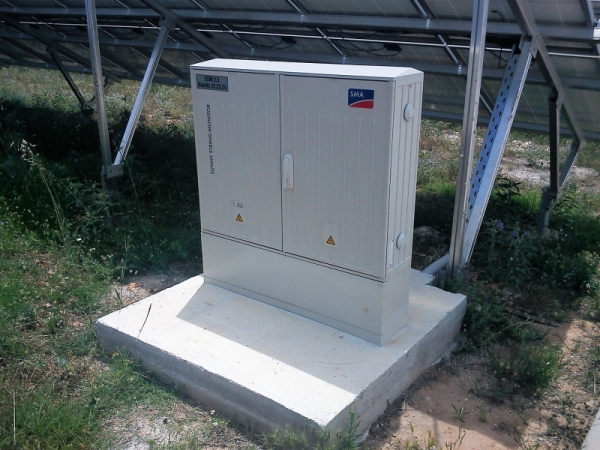 PV station includes 7840 Conergy polycrystalline pv panels, type PowerPlus 250P, installed on mounting structures by Alumil Solar. DC energy is converted to AC through three central SMA inverters, type 630CP-XT.